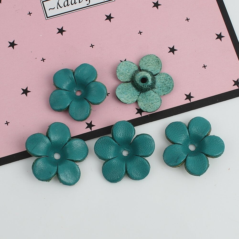 2 appliques cuir fleur bleu vert 22mm - création bijoux - sc0110245 en cuir véritable, ces appliques peuvent être utilisées en couture, pour customiser un sac, une veste ou encore pour la création de bijoux. a vous de choisir ! en avant pour la création ! venez visiter tous mes autres articles pour toutes vos créations de bijoux livraison rapide et soignée